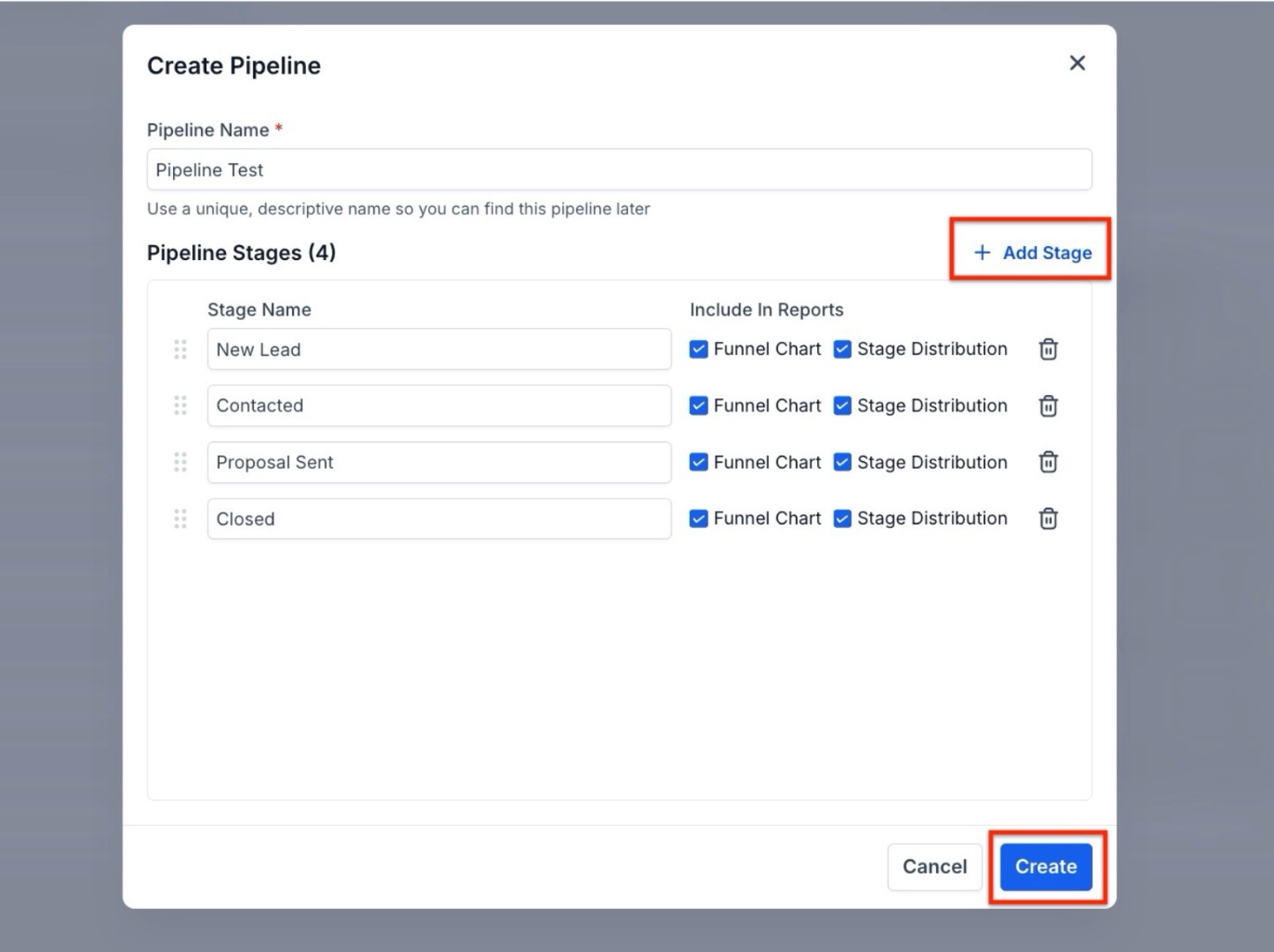 - Add Stages: Define the stages of your pipeline by clicking "Add Stage" and providing a name for each stage (e.g., "New Lead", "Contacted", "Qualified"). You can delete a stage by simply clicking on the delete icon next to a stage.