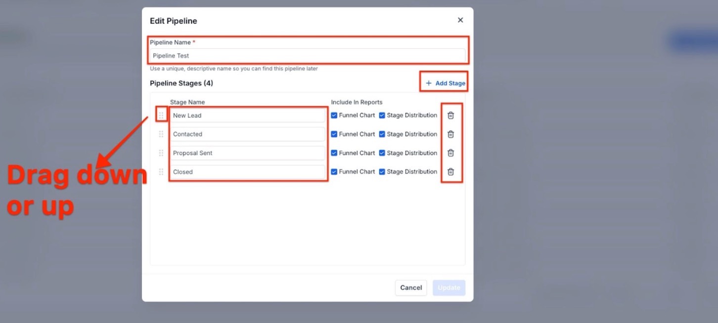 - Modify Stages: Add, remove, or rename stages as required. You can also reorder stages by dragging them.