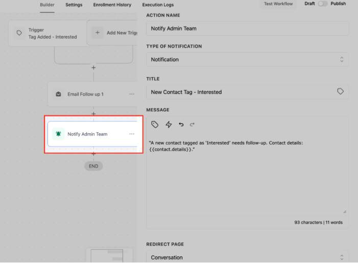 - Notify Your Team: Send an internal notification to your sales team: “A new contact tagged as ‘Interested’ needs follow-up. Contact details: {{contact.details}}.”