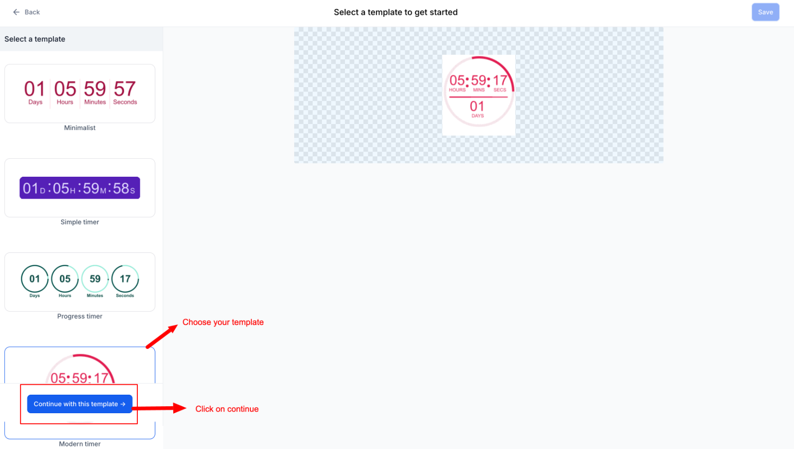 Select a design template for your timer. You can customize the design later, so pick the one that best fits your needs and click "Continue with this template."